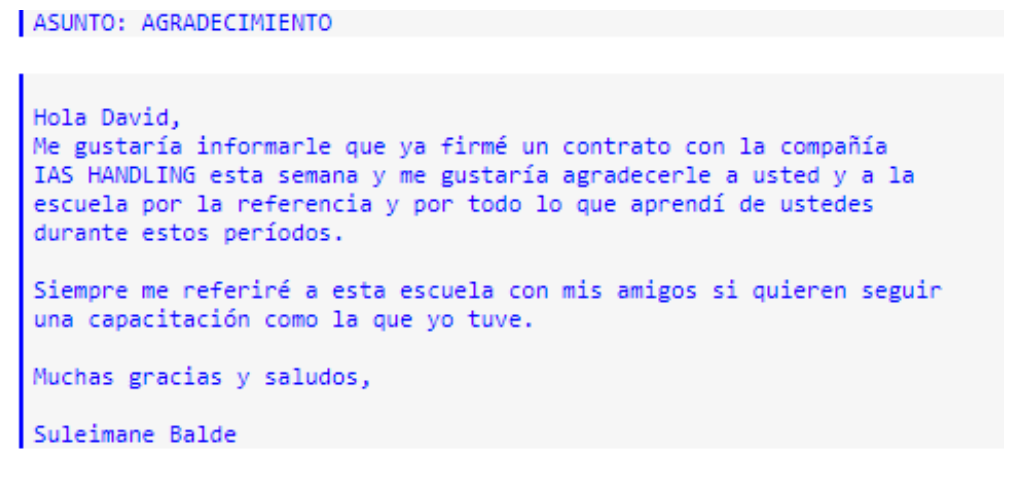 Carta de agradecimiento de nuestro alumno Diego de Alicante, tras conseguir un puesto de trabajo en Azul Handling